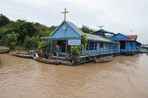 It’s a natural pressure-release valve that absorbs the massive flood surge and slowly releases it, stabilizing the lower river basin. And when we talk about volume, the Tonlé Sap expands from roughly 2,500 square kilometers in the dry season to more than 12,000 square kilometers at its peak, and the water level in the lake rises nearly 30 feet! Put another way, that’s about 25 trillion gallons of water…