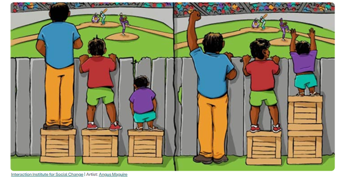 Another way to describe equity is equal outcomes, whereas equality refers to equal opportunity. The image below captures this idea of equity, where each person can now see the baseball team over the fence because they’re provided unequal support.1