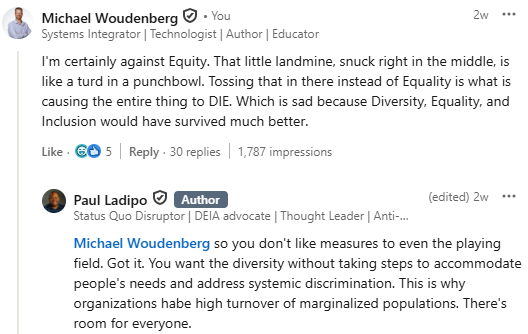 Swinging back to that LinkedIn post, in their defense of DEI, none of those commenting on my observation demonstrated the bare semblance of interest in the diversity I added. They certainly showed no inclination toward inclusion while using every tactic and logical fallacy in the book to shut down the conversation and exclude my contribution.
